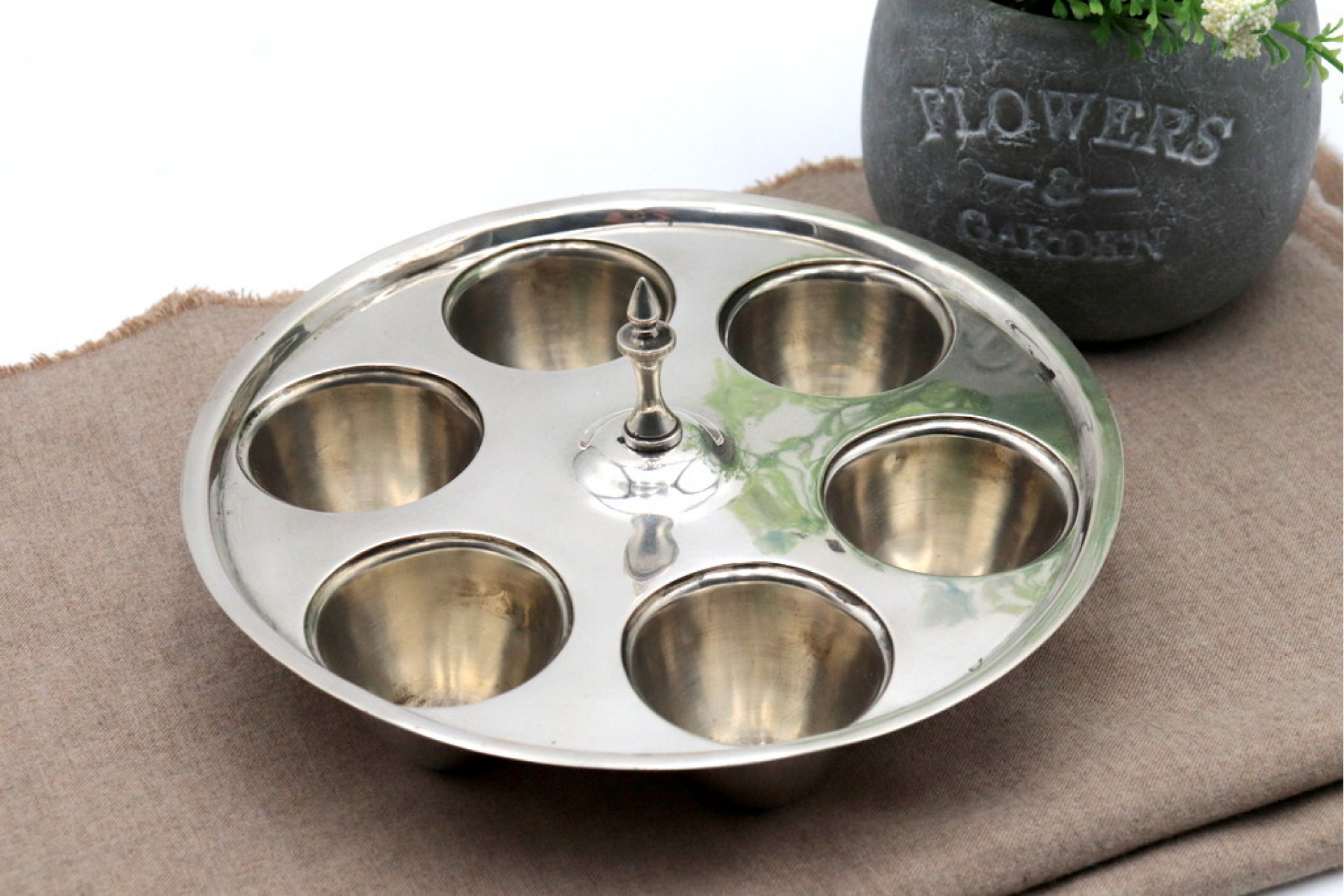 Suporte em prata para seis ovos com pomo na pega relevada.