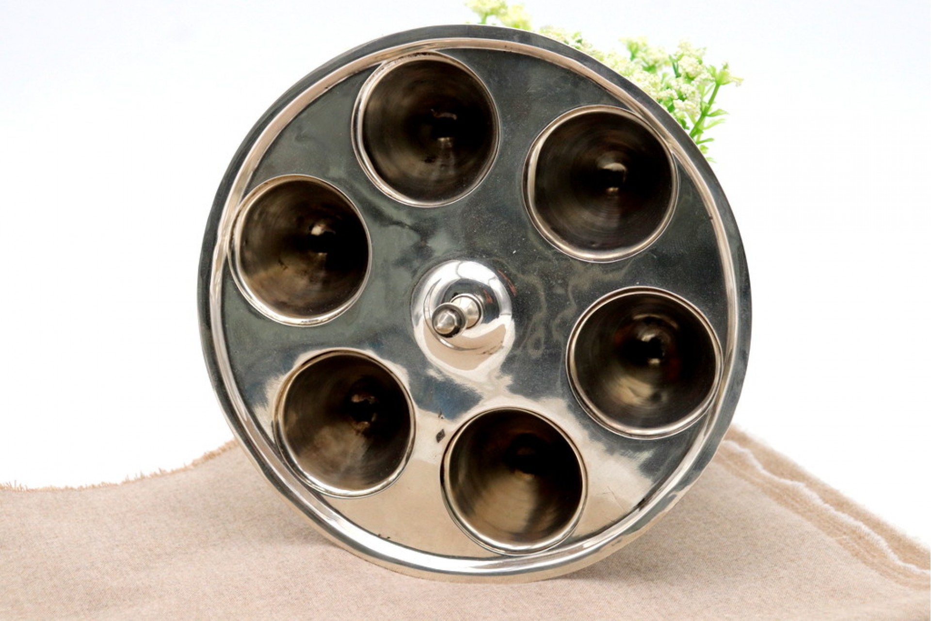 • Descrição: Suporte em prata para seis ovos com pomo na pega relevada.