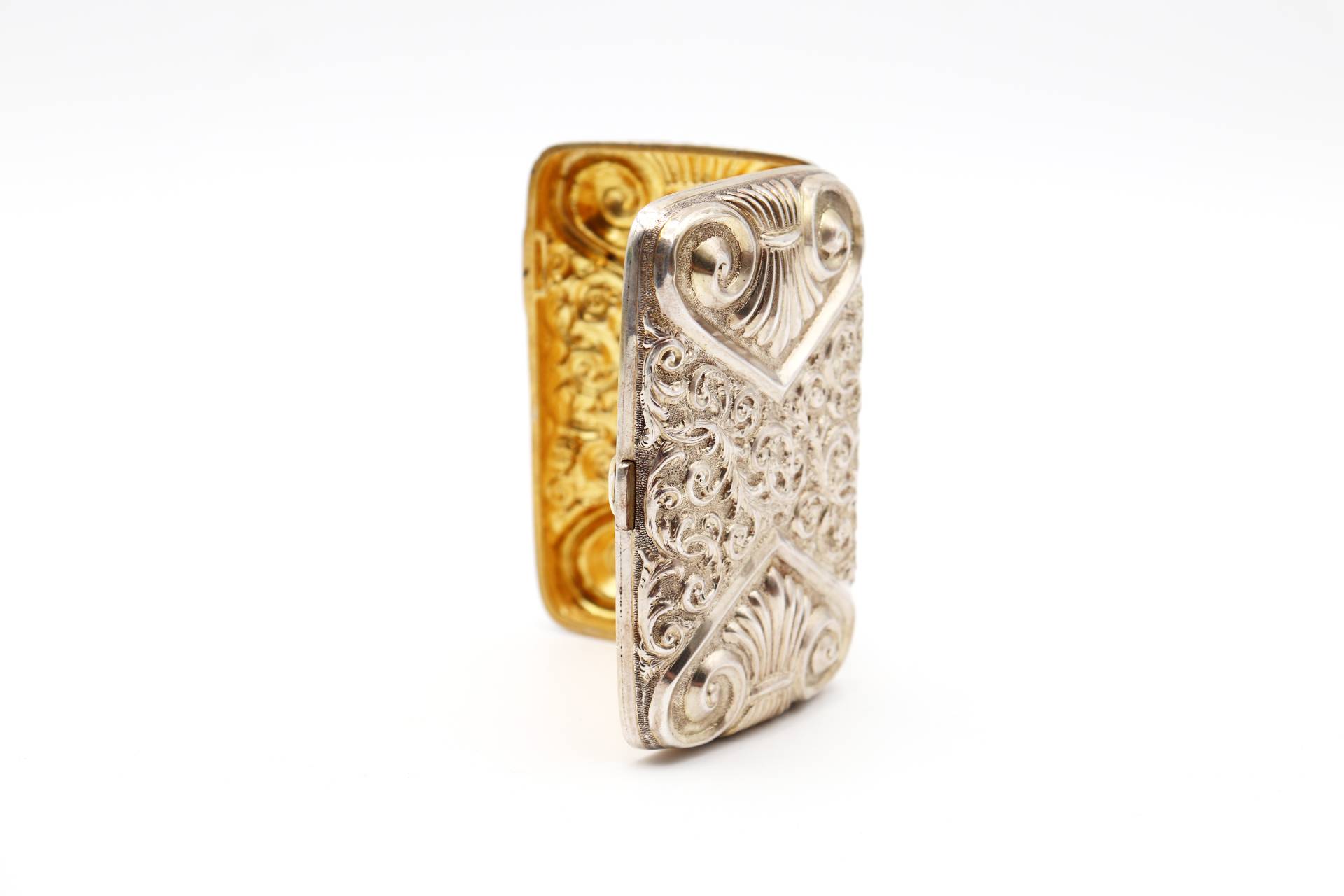 • Descrição: Tabaqueira em prata profusamente relevada ao estilo Art Nouveau