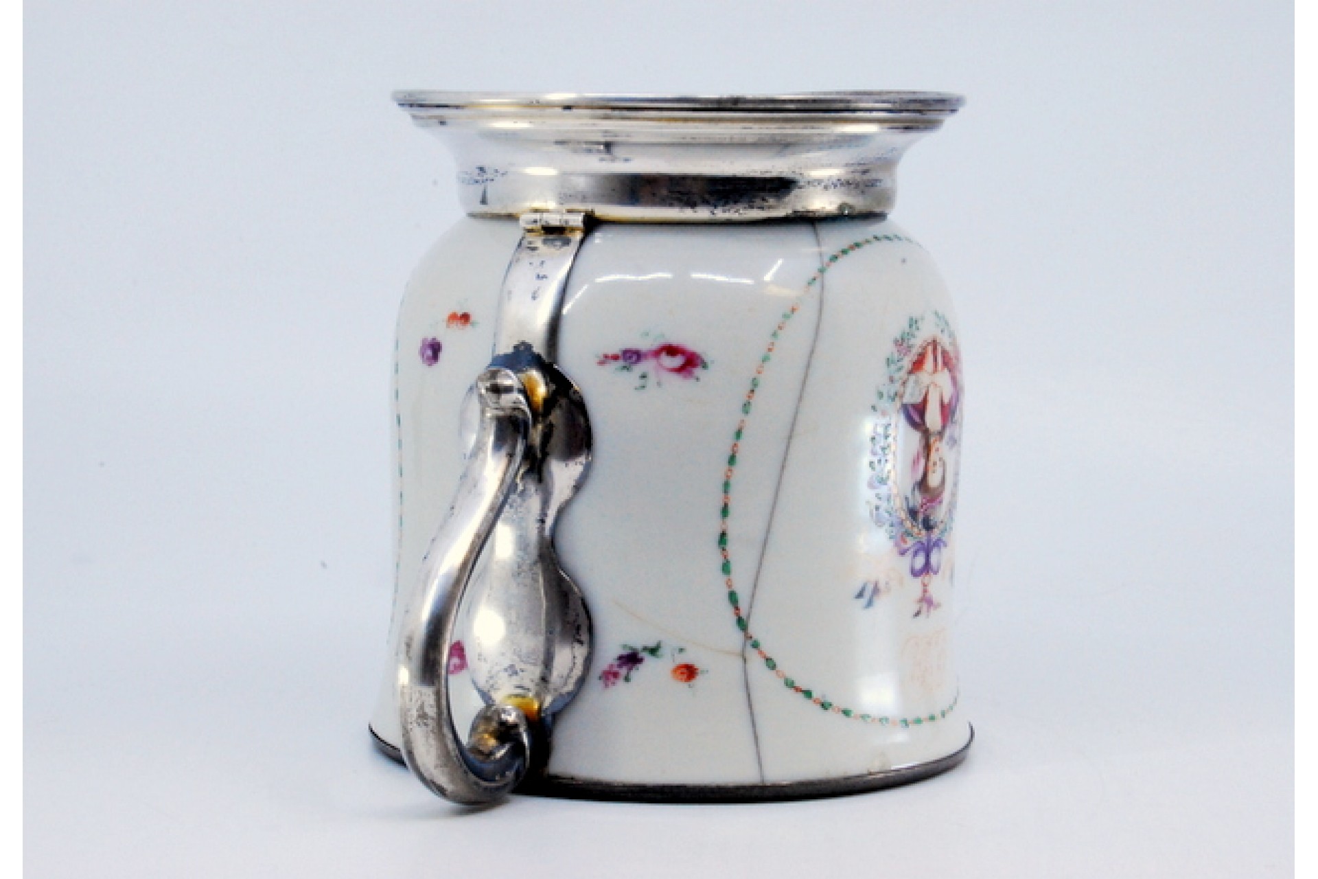 Caneca em porcelana com motivos japoneses, com base, pegas e rebordo em prata.