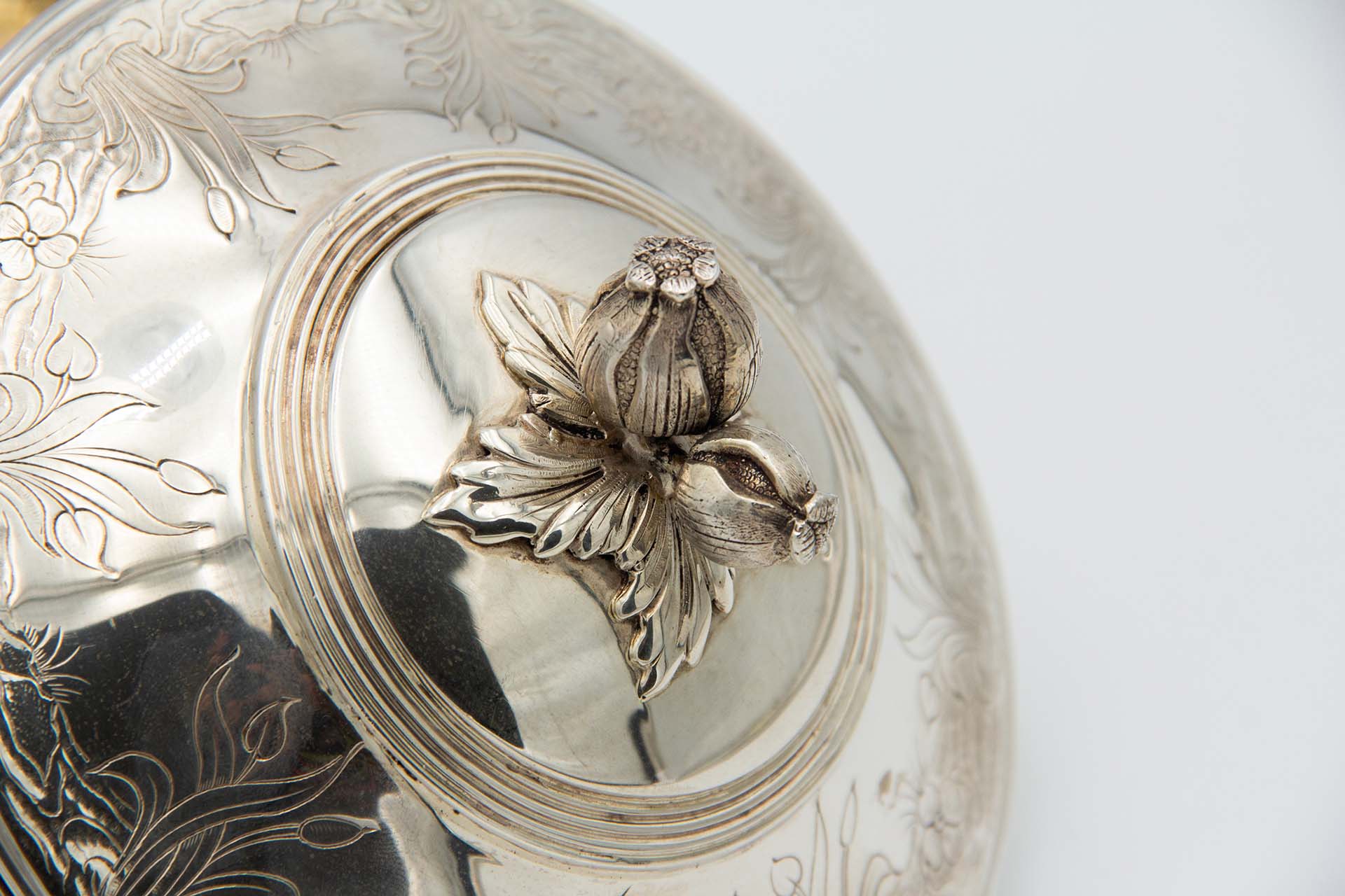 • Descrição: Terrina de sopa em prata com gravados e pomo na tampa em forma de bolbos, quatro pés de suporte em formato de garras e duas asas em vulto perfeito de folhas de acanto.