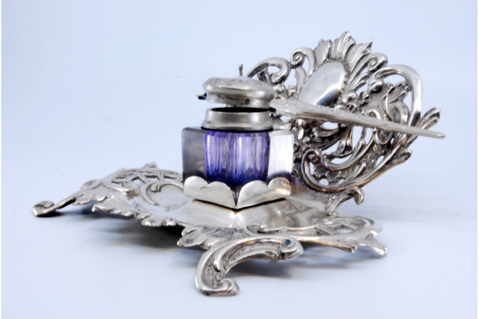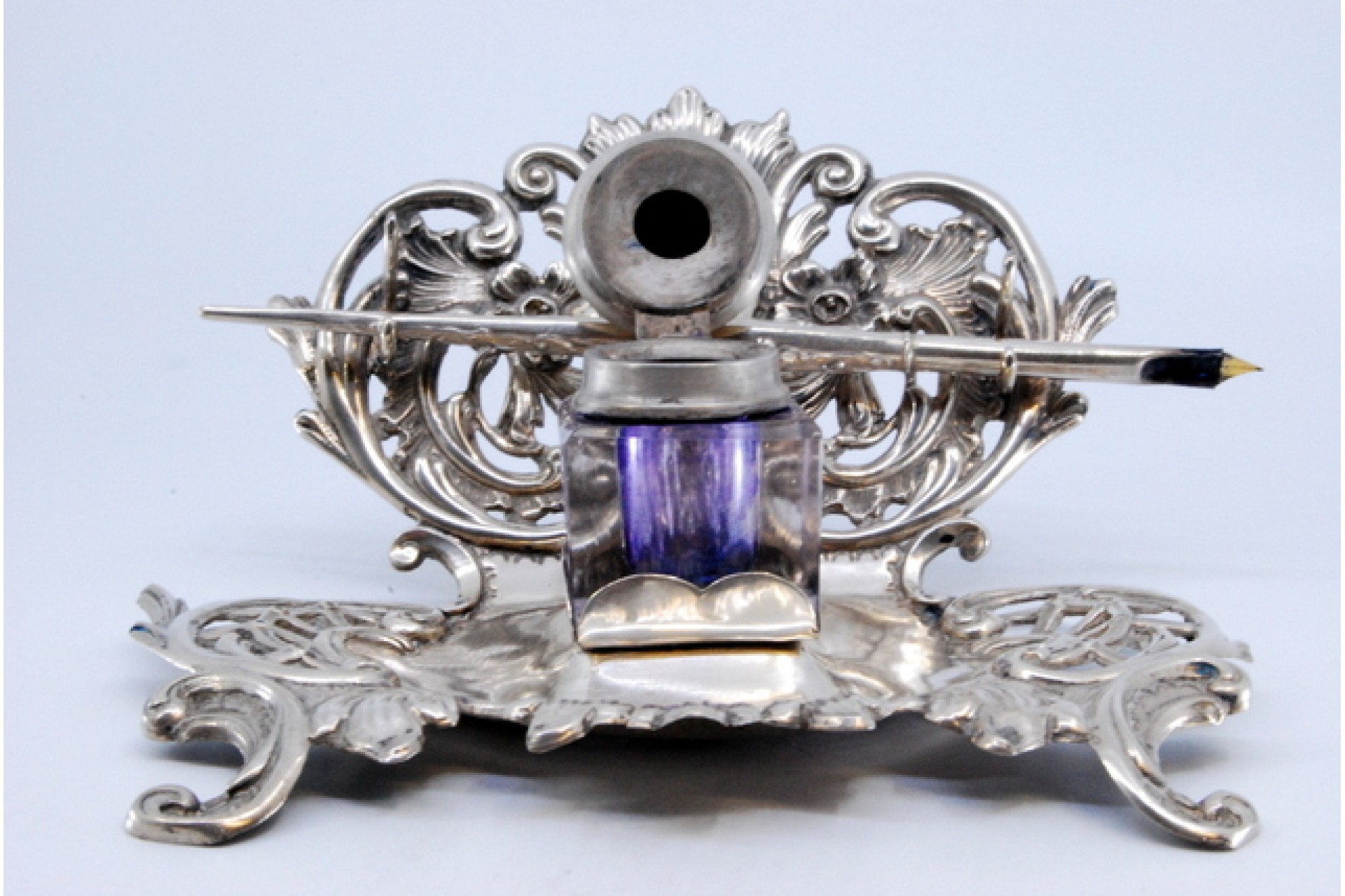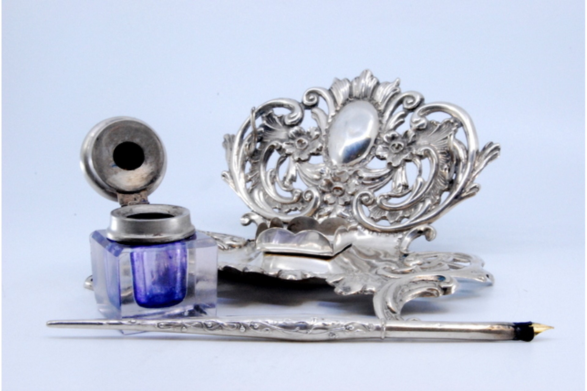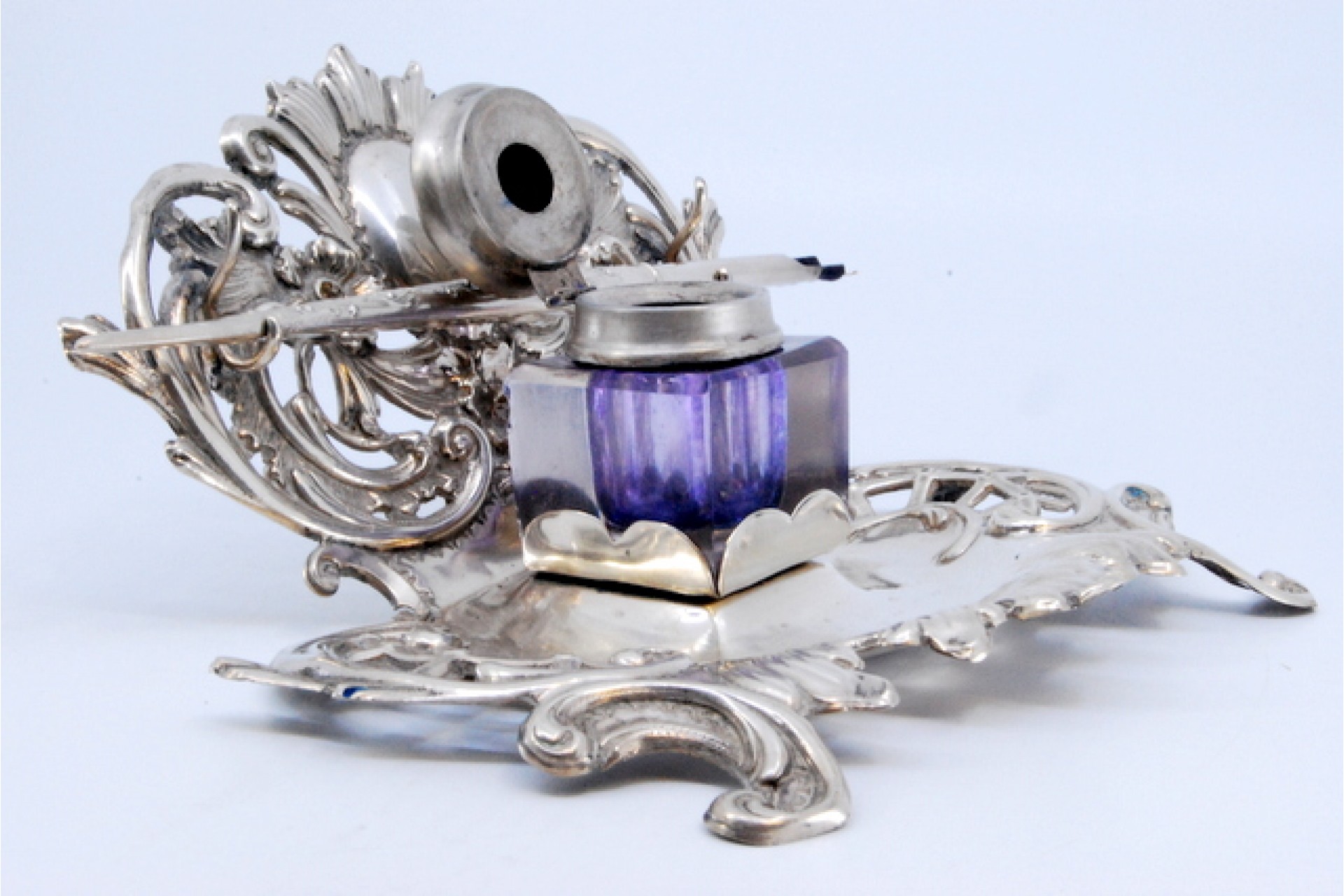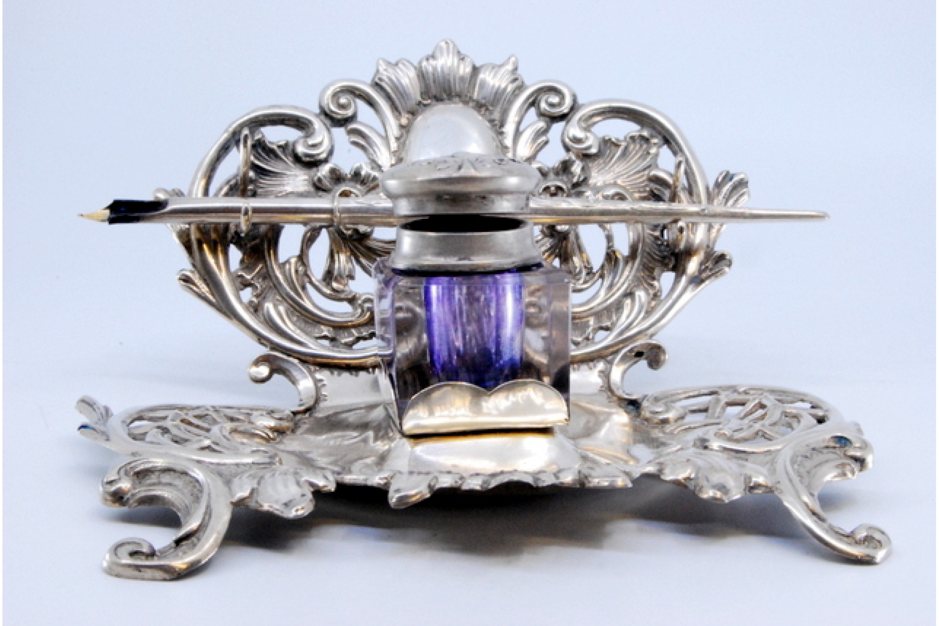 • Descrição: Tinteiro em prata recortada com depósito em vidro, cartela para monograma e suporte de caneta.