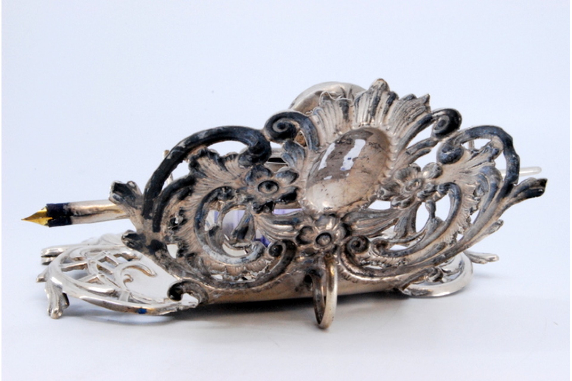 Tinteiro em prata recortada com depósito em vidro, cartela para monograma e suporte de caneta.