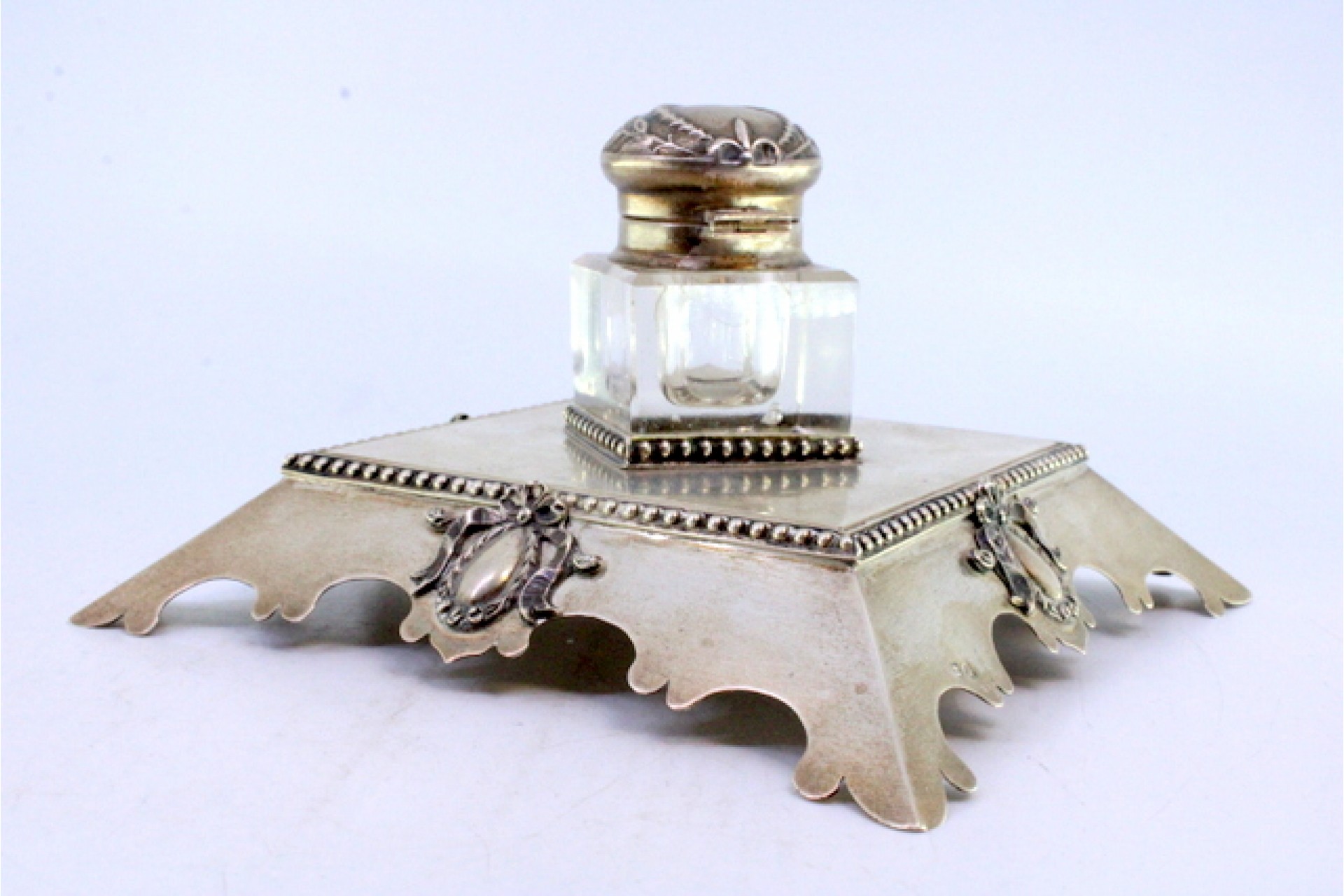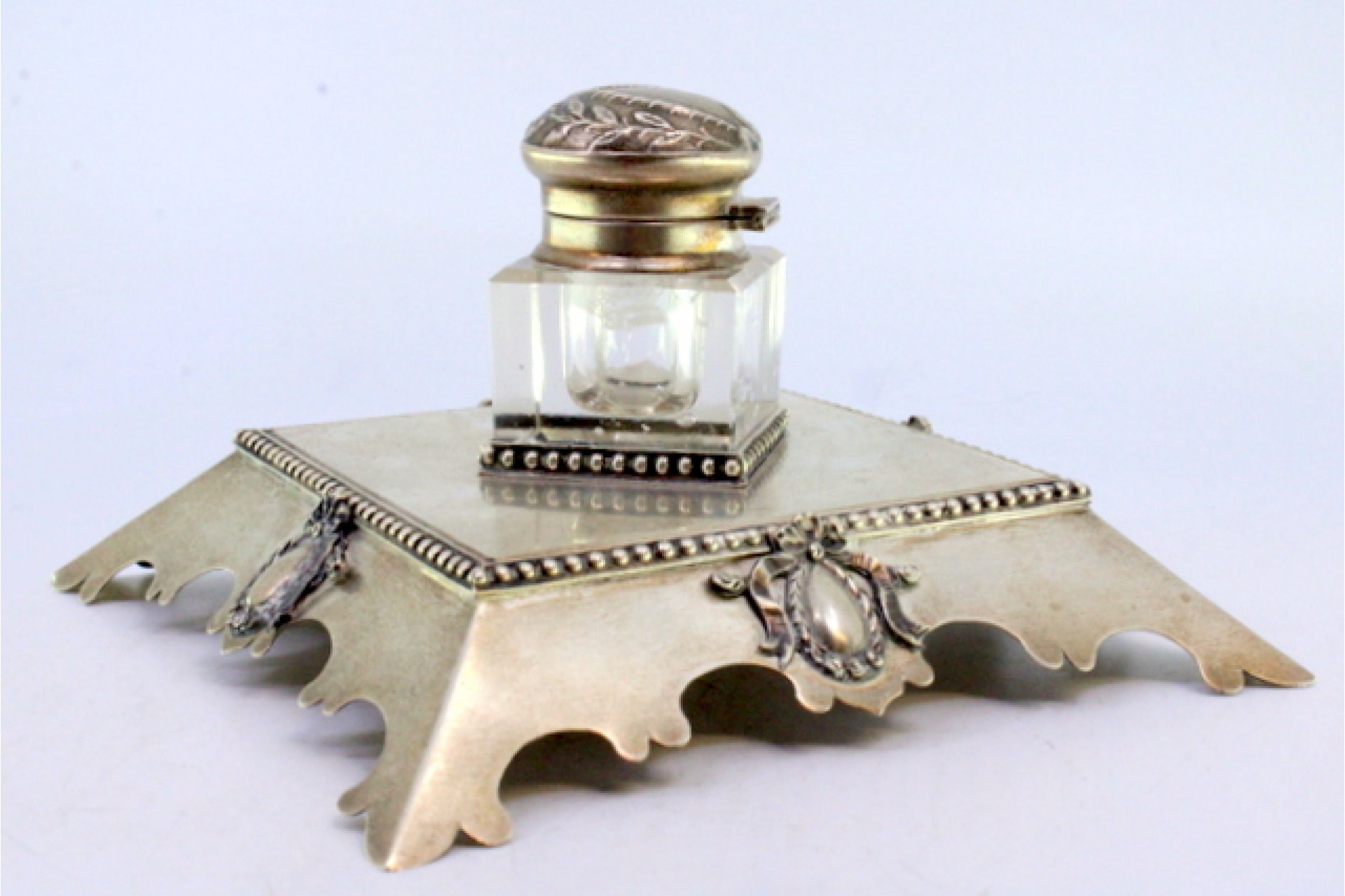 • Descrição: Tinteiro com base em prata perlada na envolvência com laços e brasões com depósito em vidro e tampa articulada.