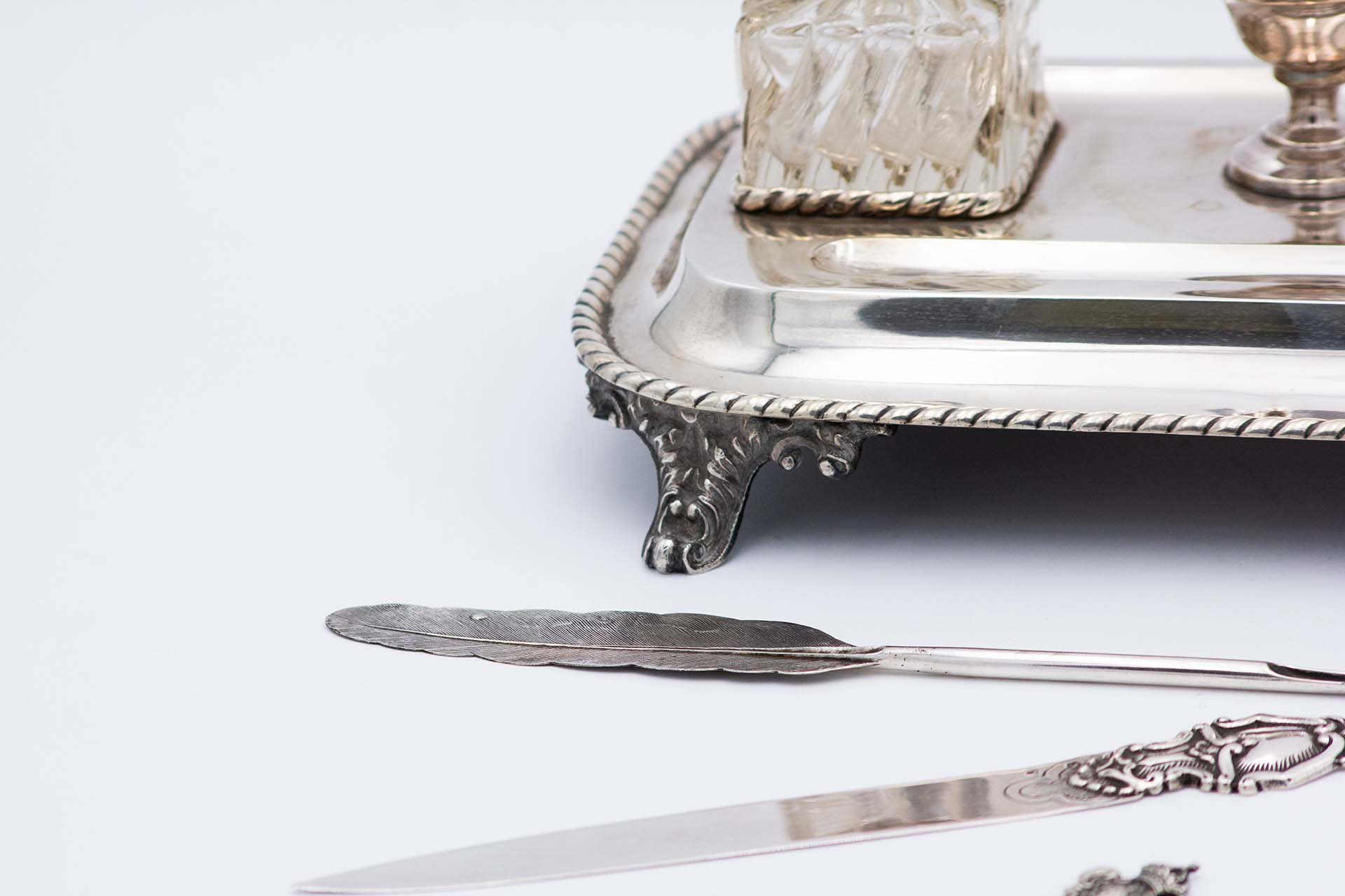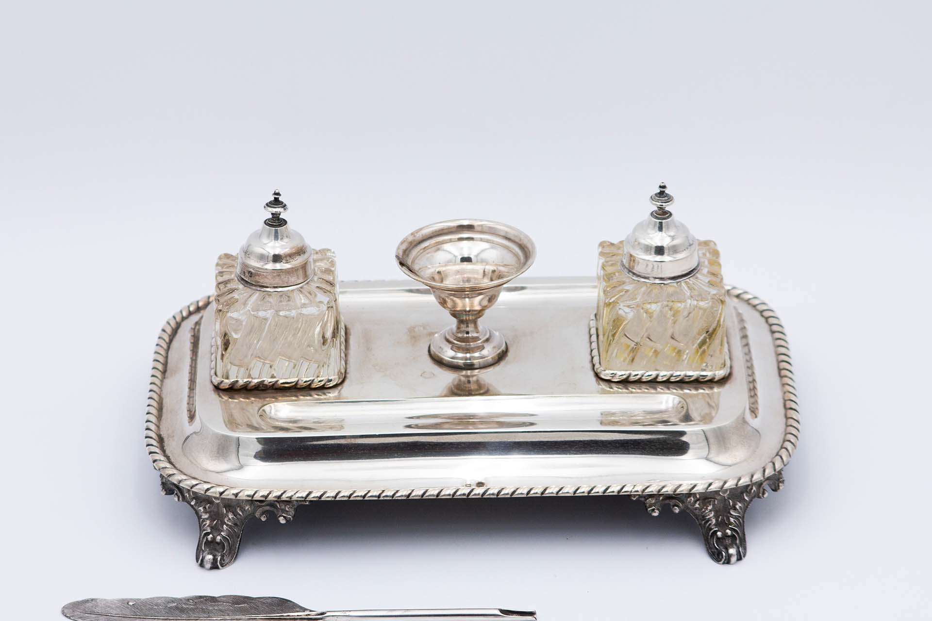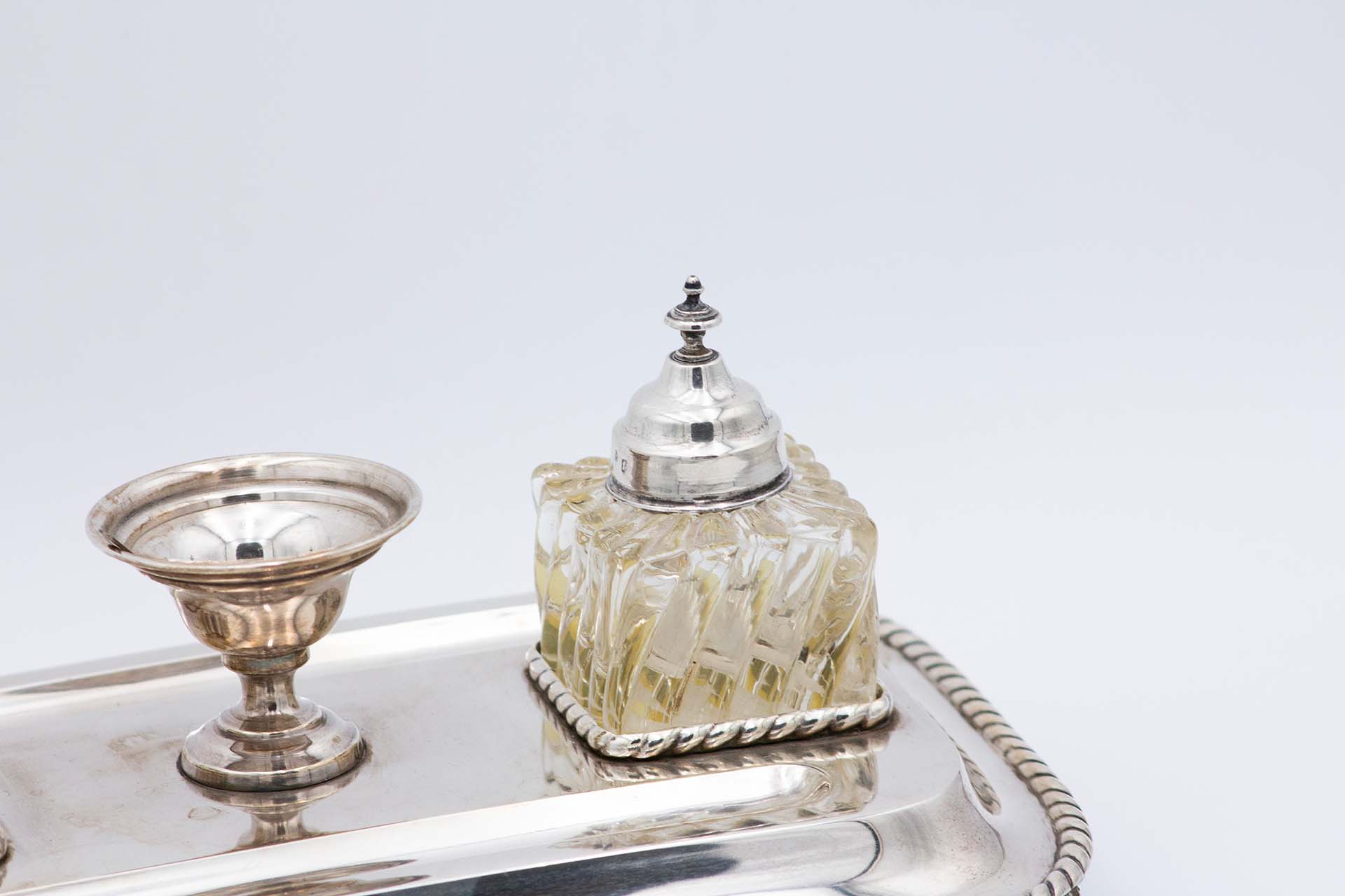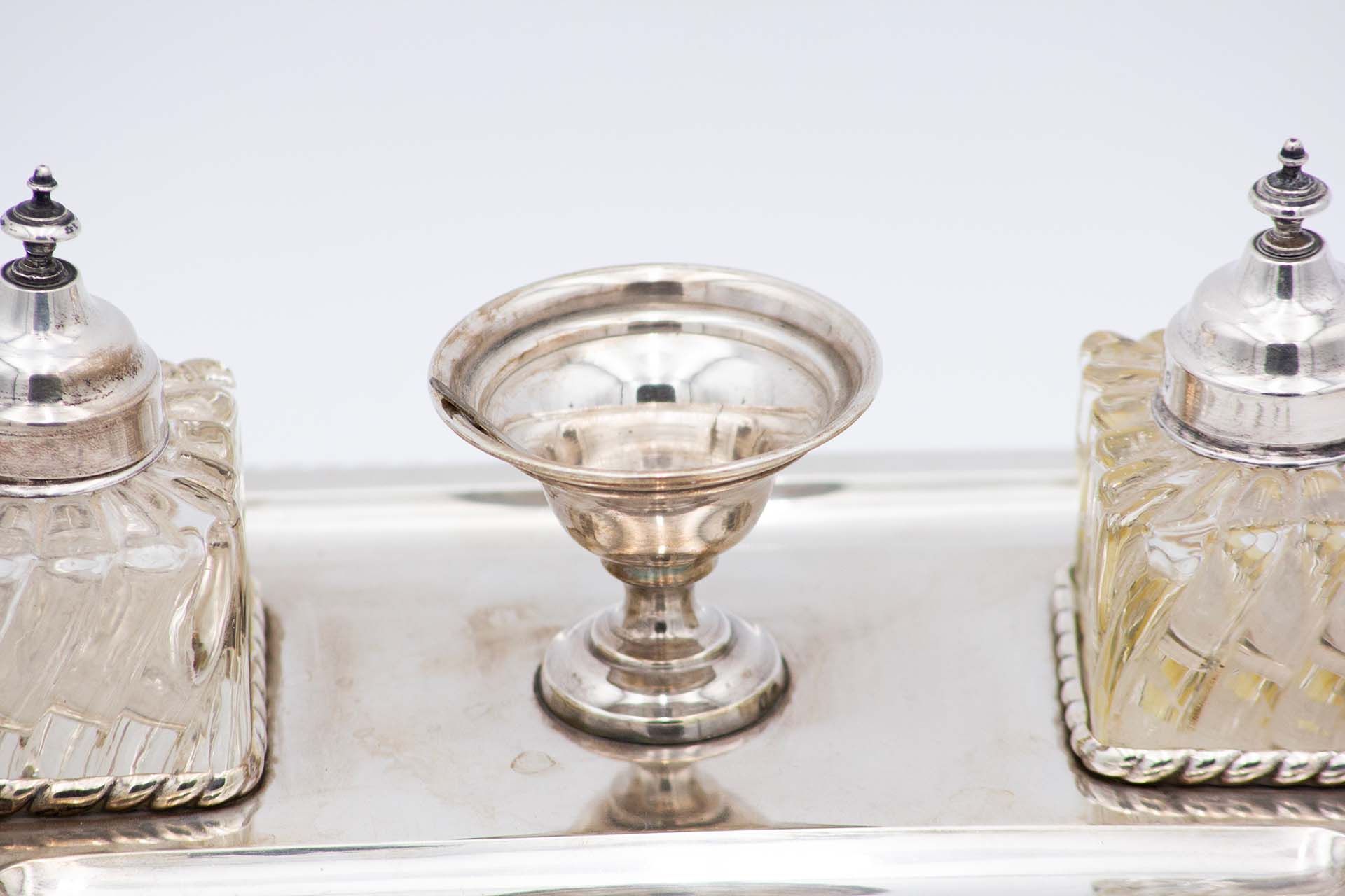 Tinteiro de prata com dois depósitos em vidro lapidado