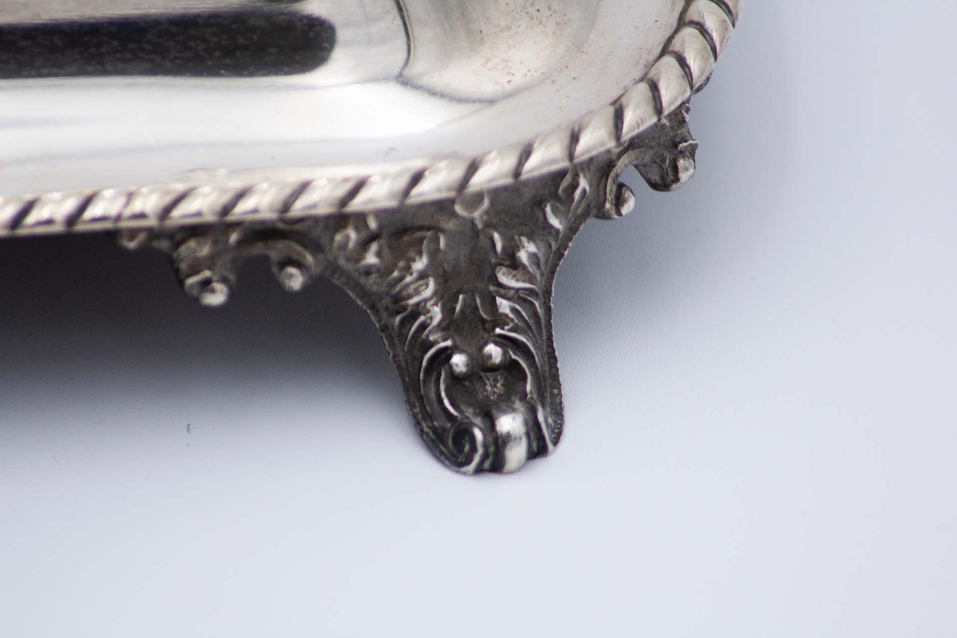 • Descrição: Tinteiro de prata com dois depósitos em vidro lapidado e quatro elementos de suporte relevados, friso cordeado na envolvência.