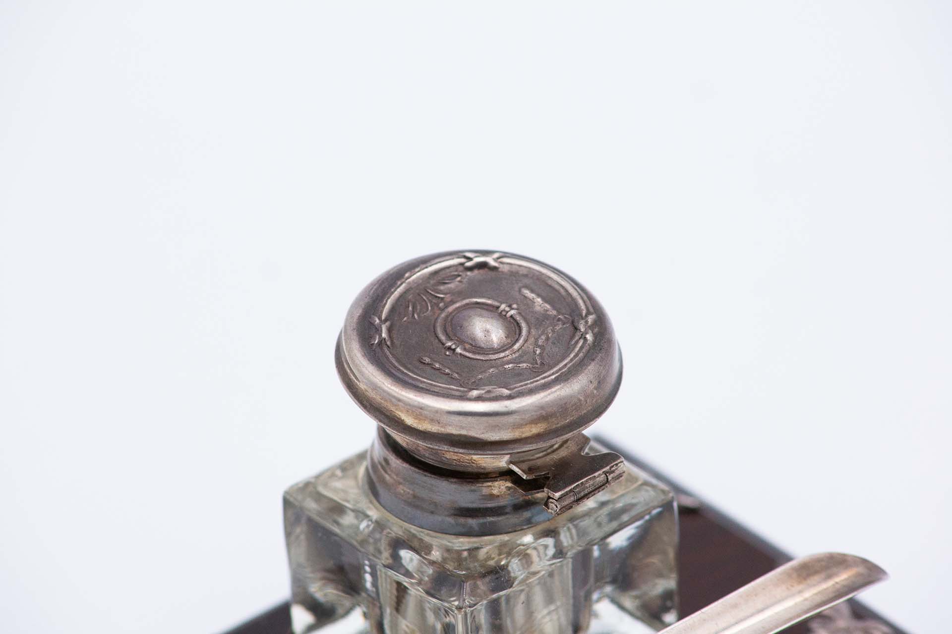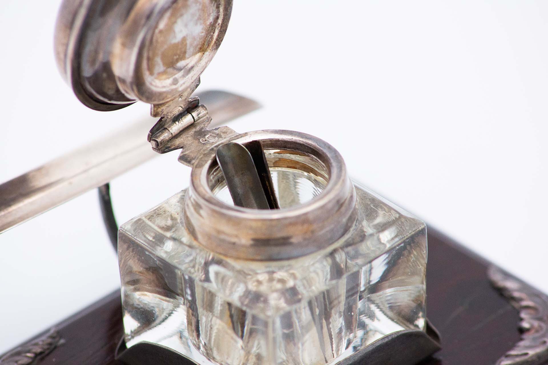 • Descrição: Tinteiro em prata com depósito em vidro, porta penas e aplicações na base de madeira.