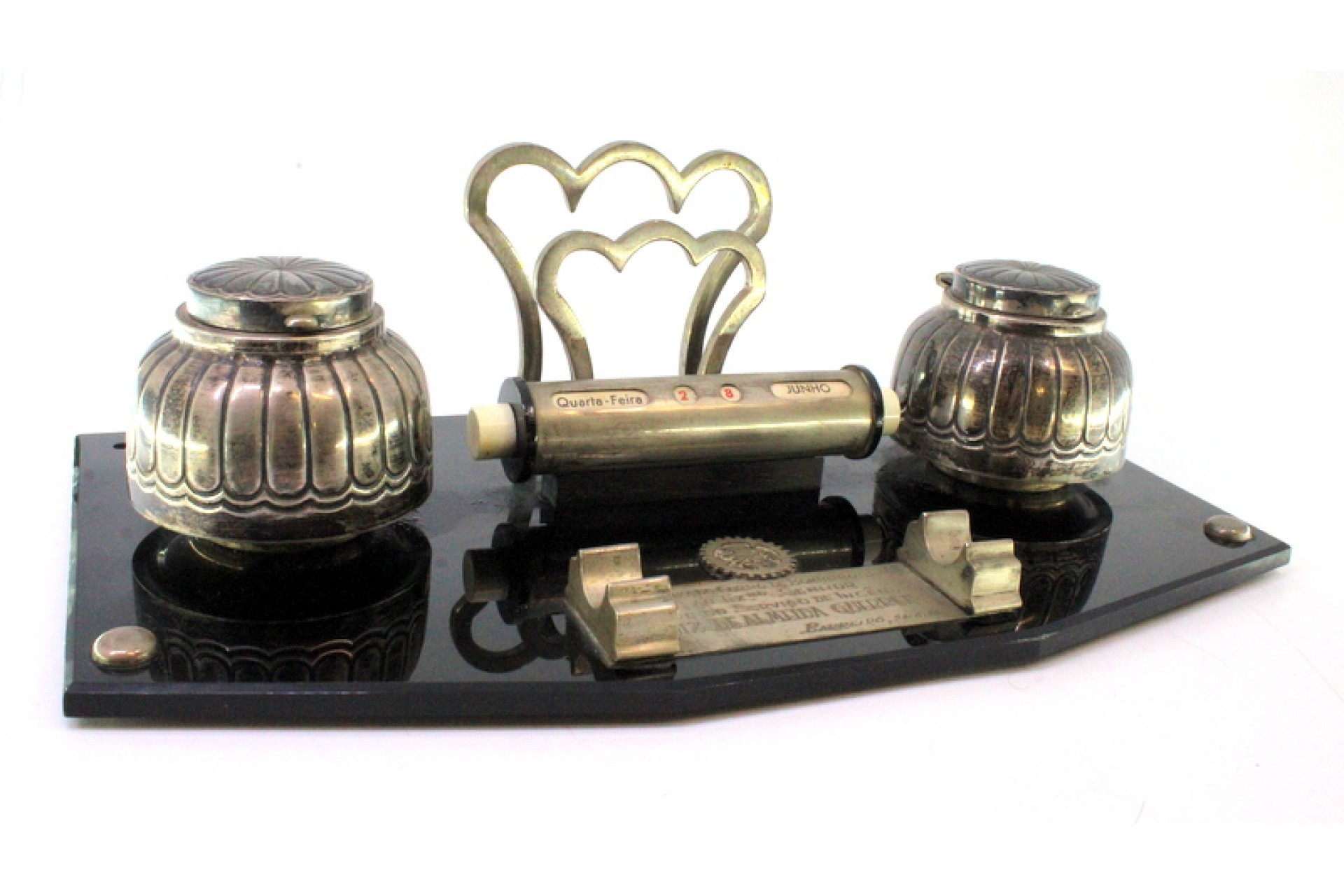 Tinteiro em prata com dois depósitos calendário e suporte para caneta e cartas