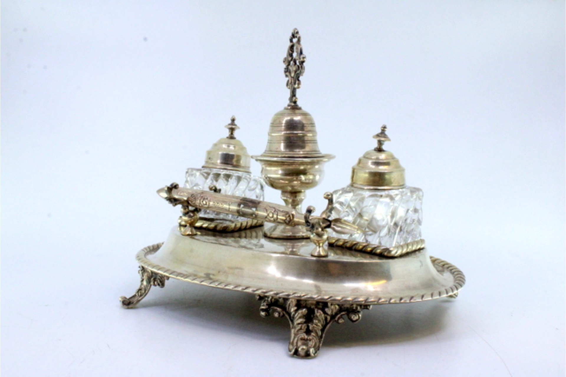 • Descrição: Tinteiro em prata com dois depósitos em vidro, campainha, suporte para canetas, friso na envolvência e assente em quatro pés relevados.