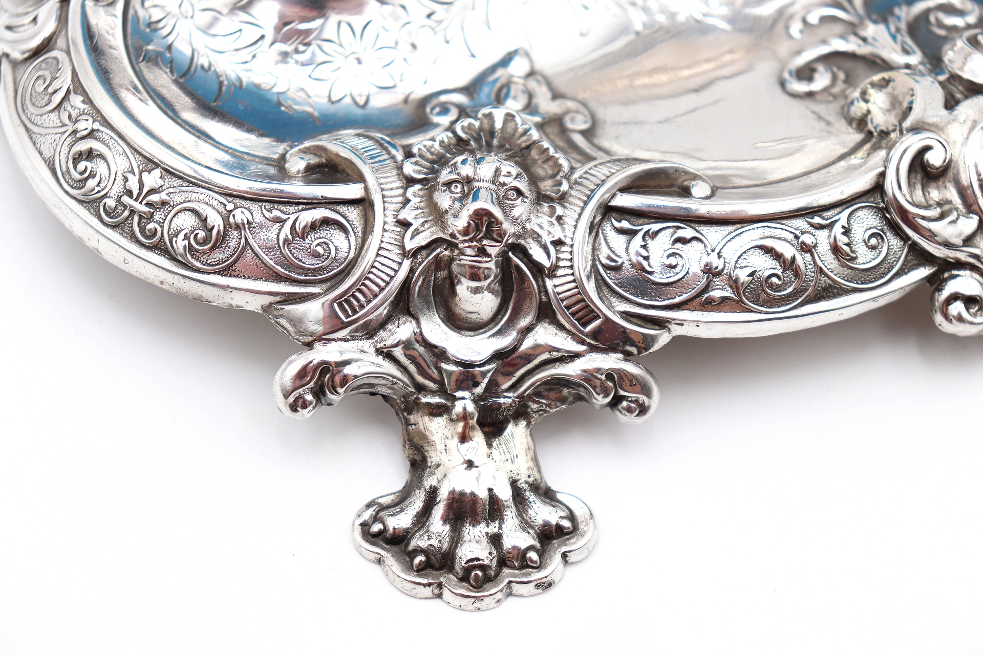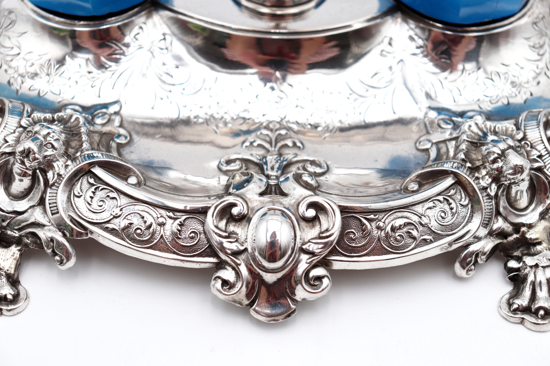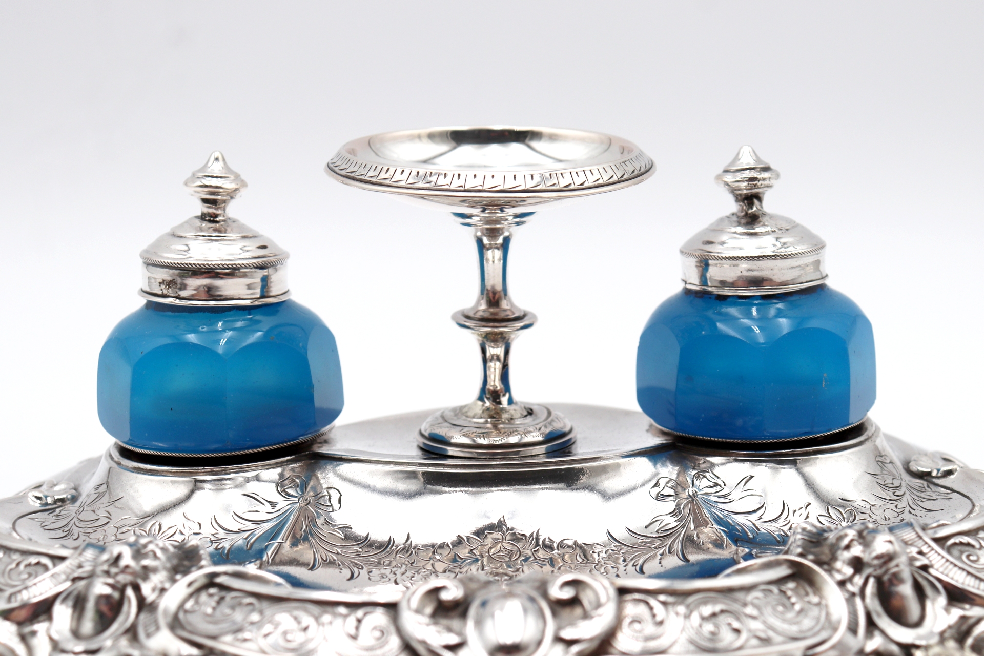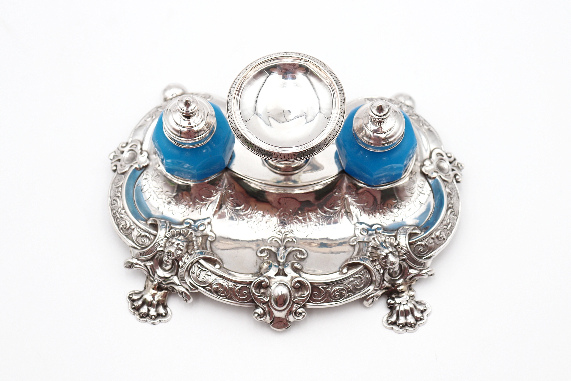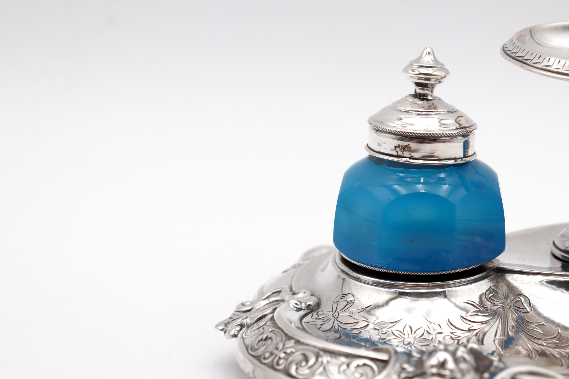 Tinteiro em prata com gravados vegetalistas na base e depósitos de vidro azul