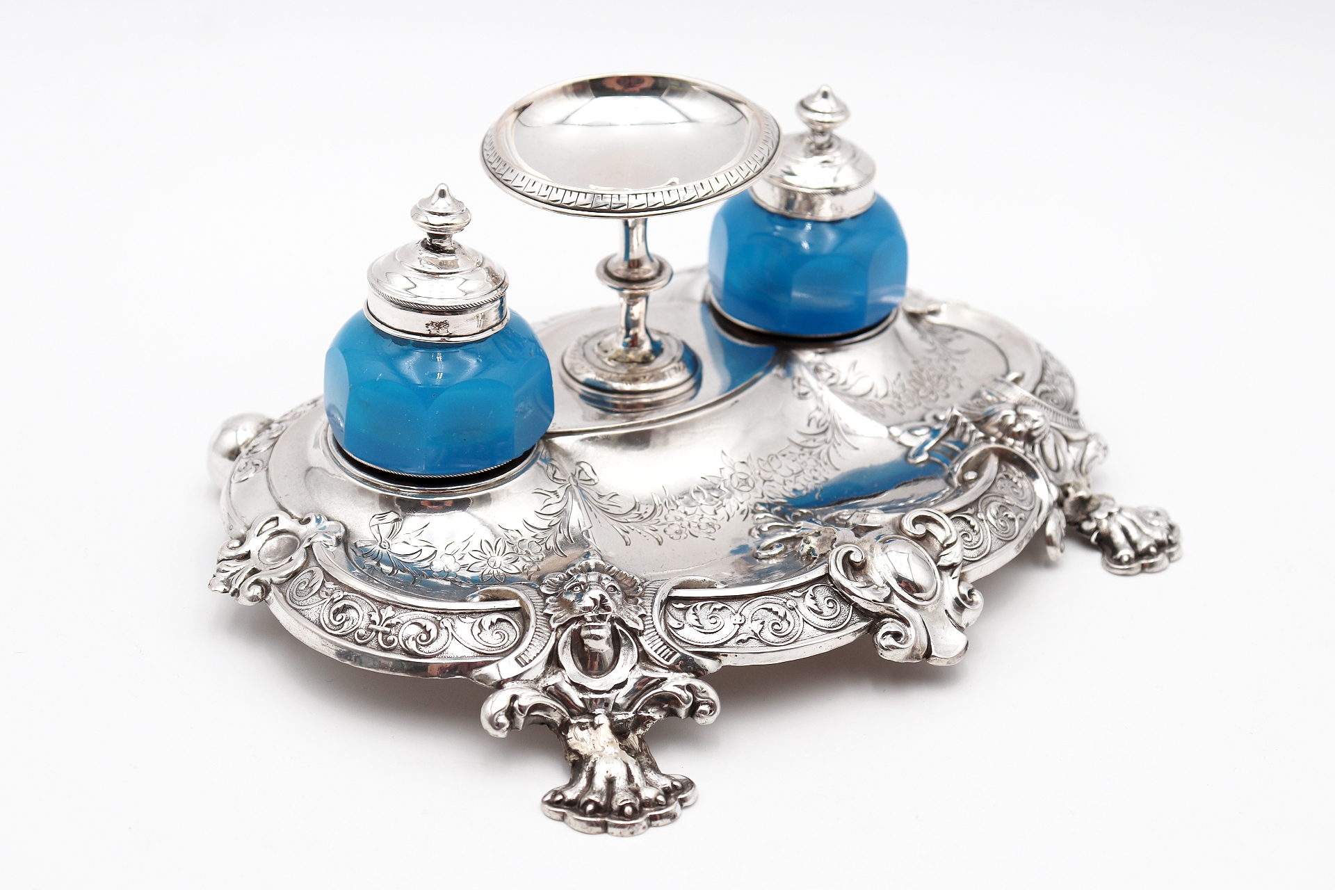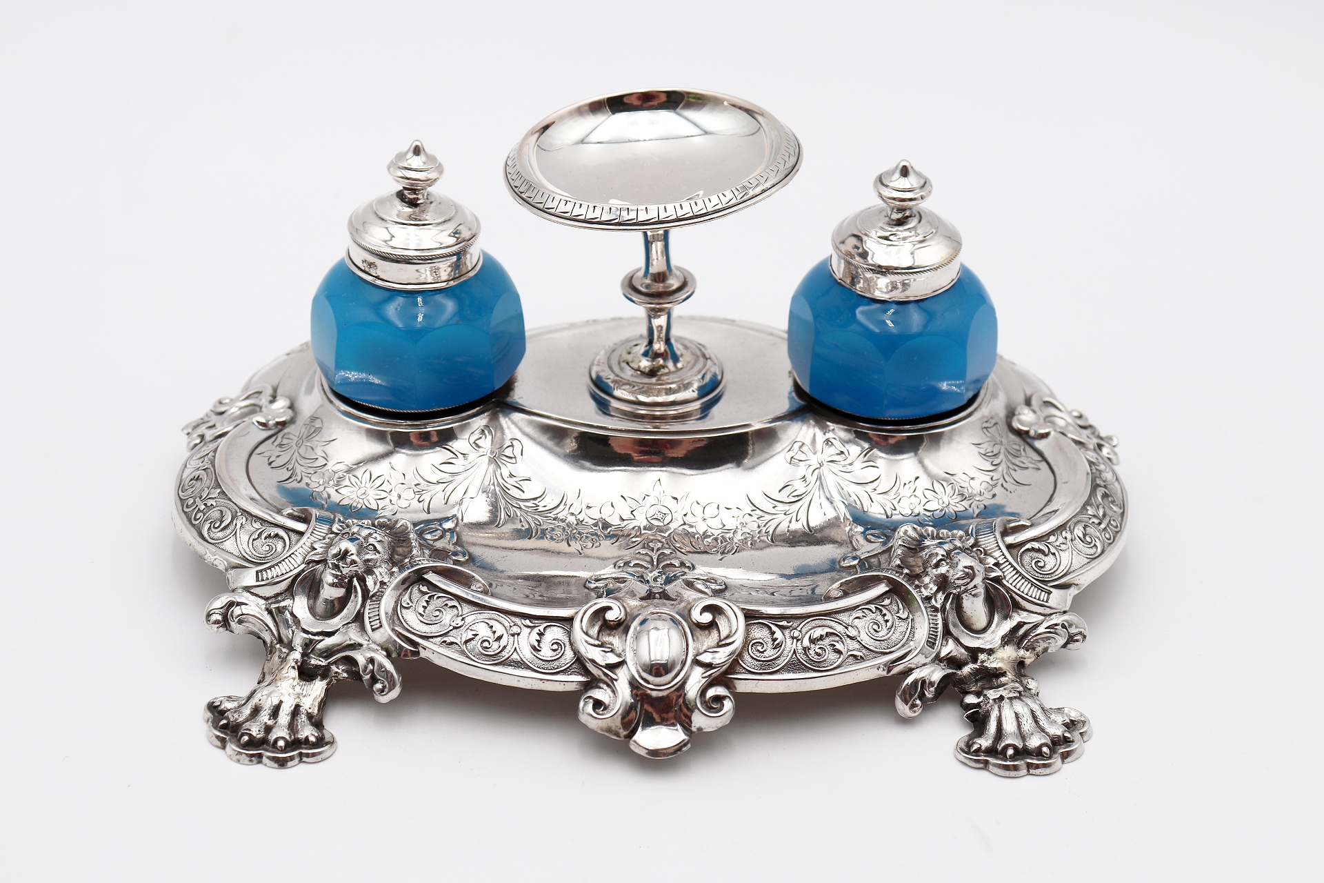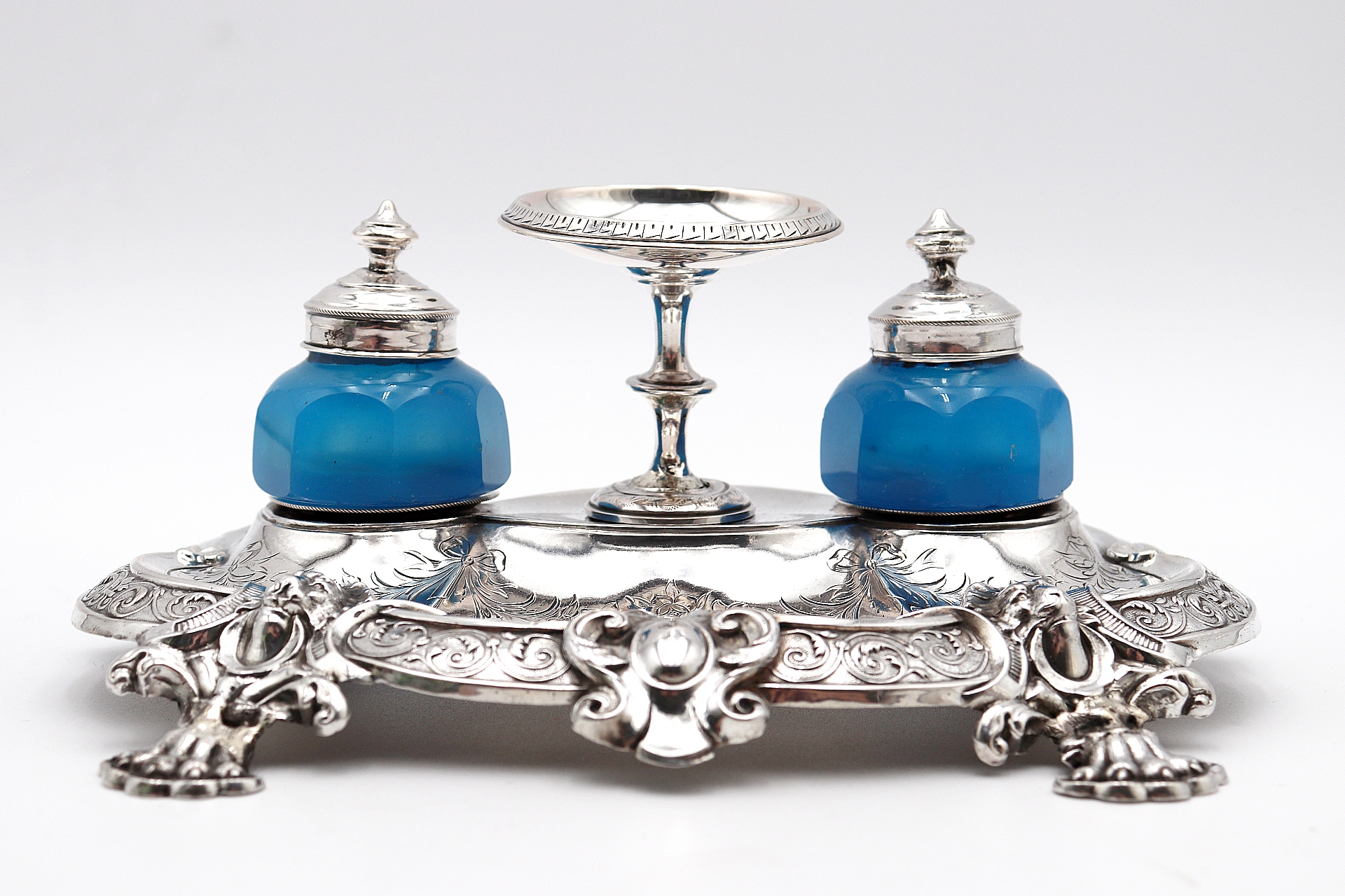 • Descrição: Tinteiro em prata com gravados vegetalistas na base e depósitos de vidro azul em formato octogonal, assente em pés em forma de garra