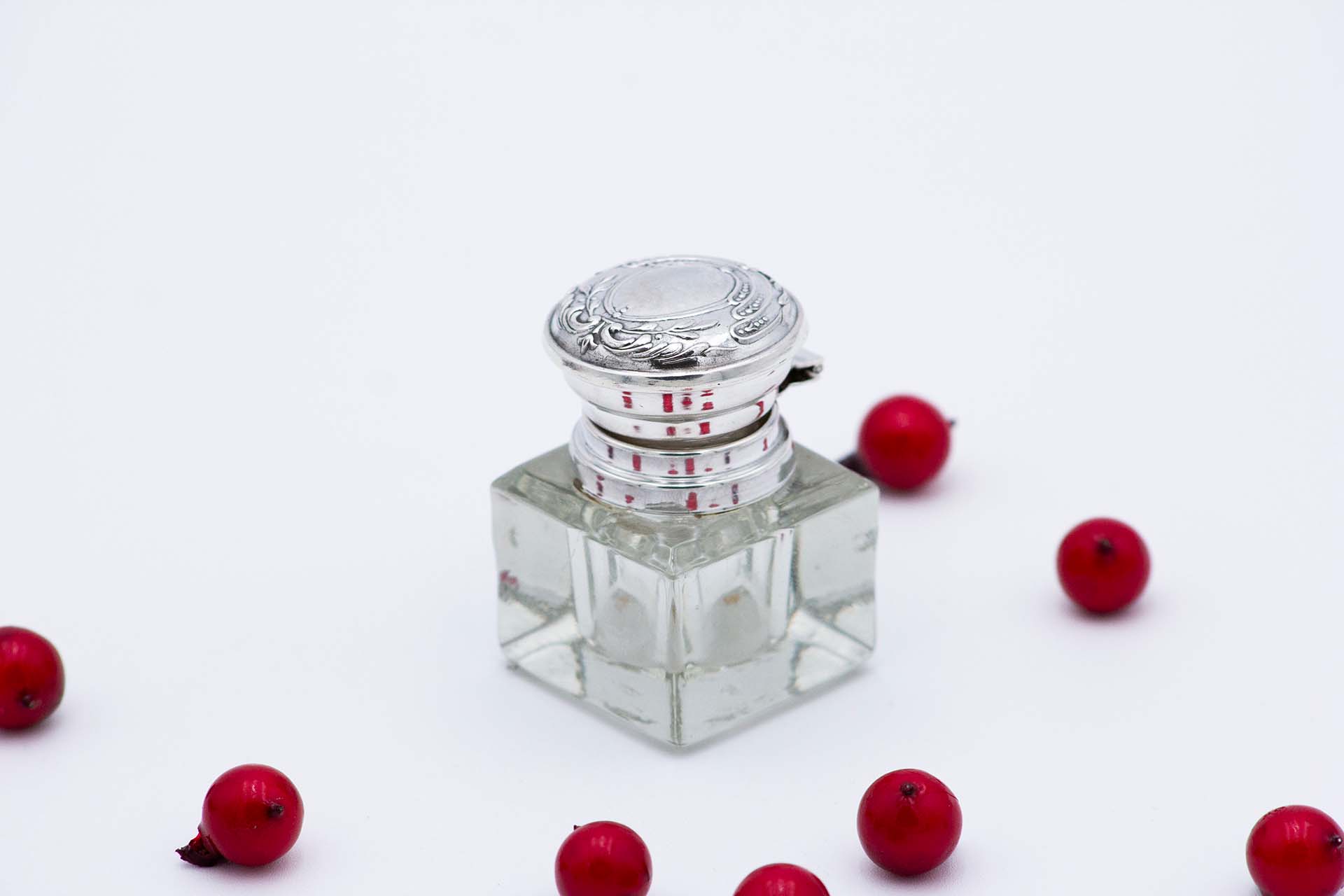 Etiquetas: Prata, Tinteiro, Vidro, Relevos, Flores