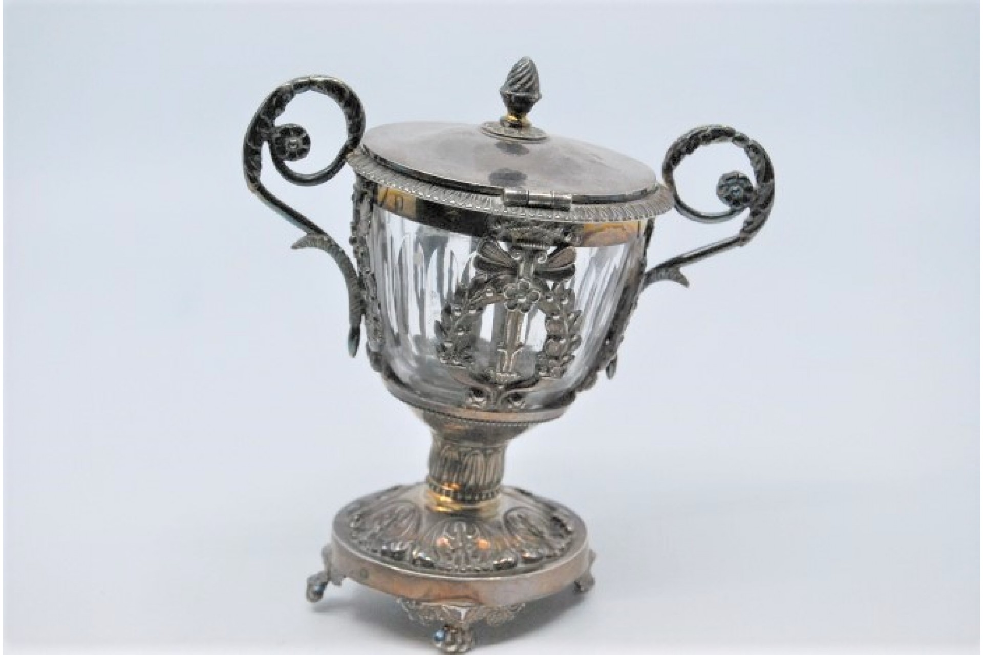• Descrição: Compoteira em vidro com estrutura em prata relevada e tampa amovível.