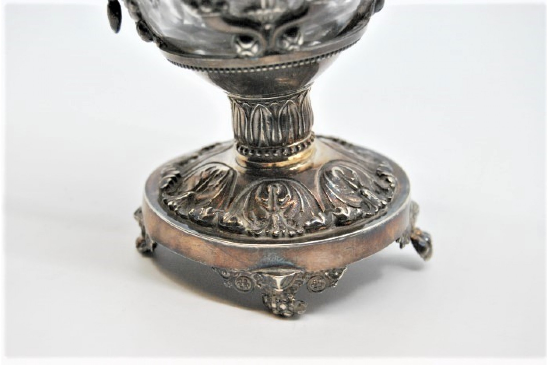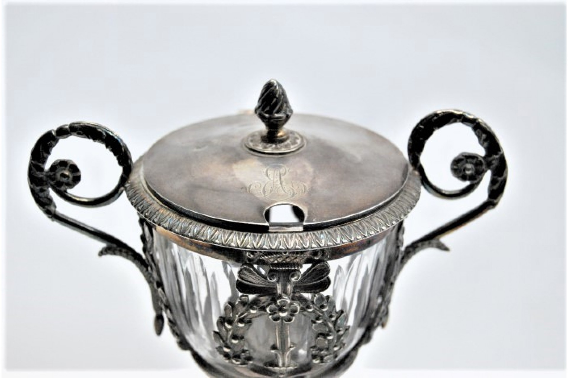 Compoteira em vidro com estrutura em prata relevada e tampa amovível.