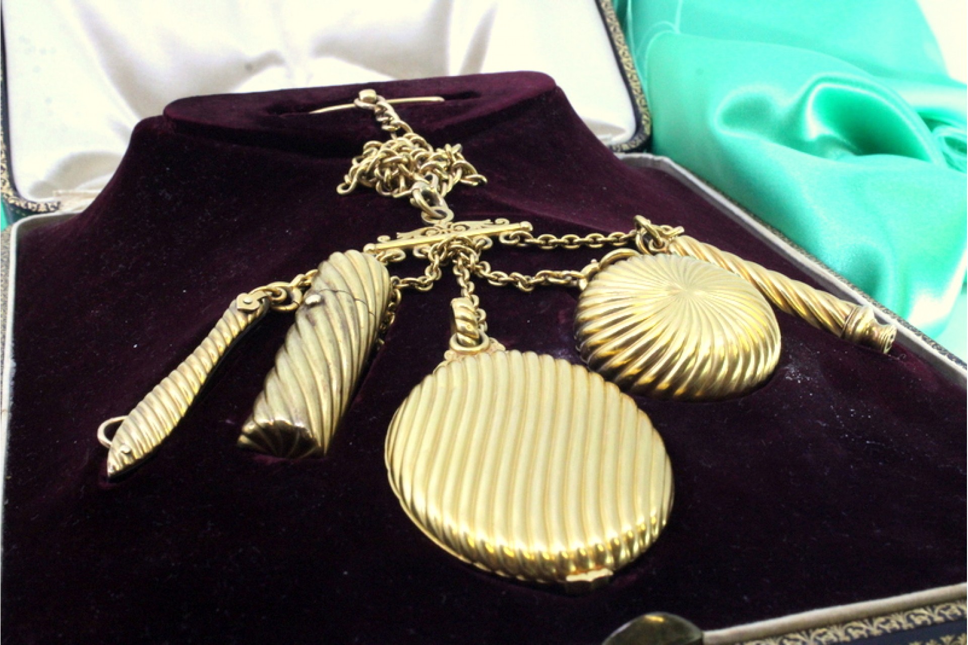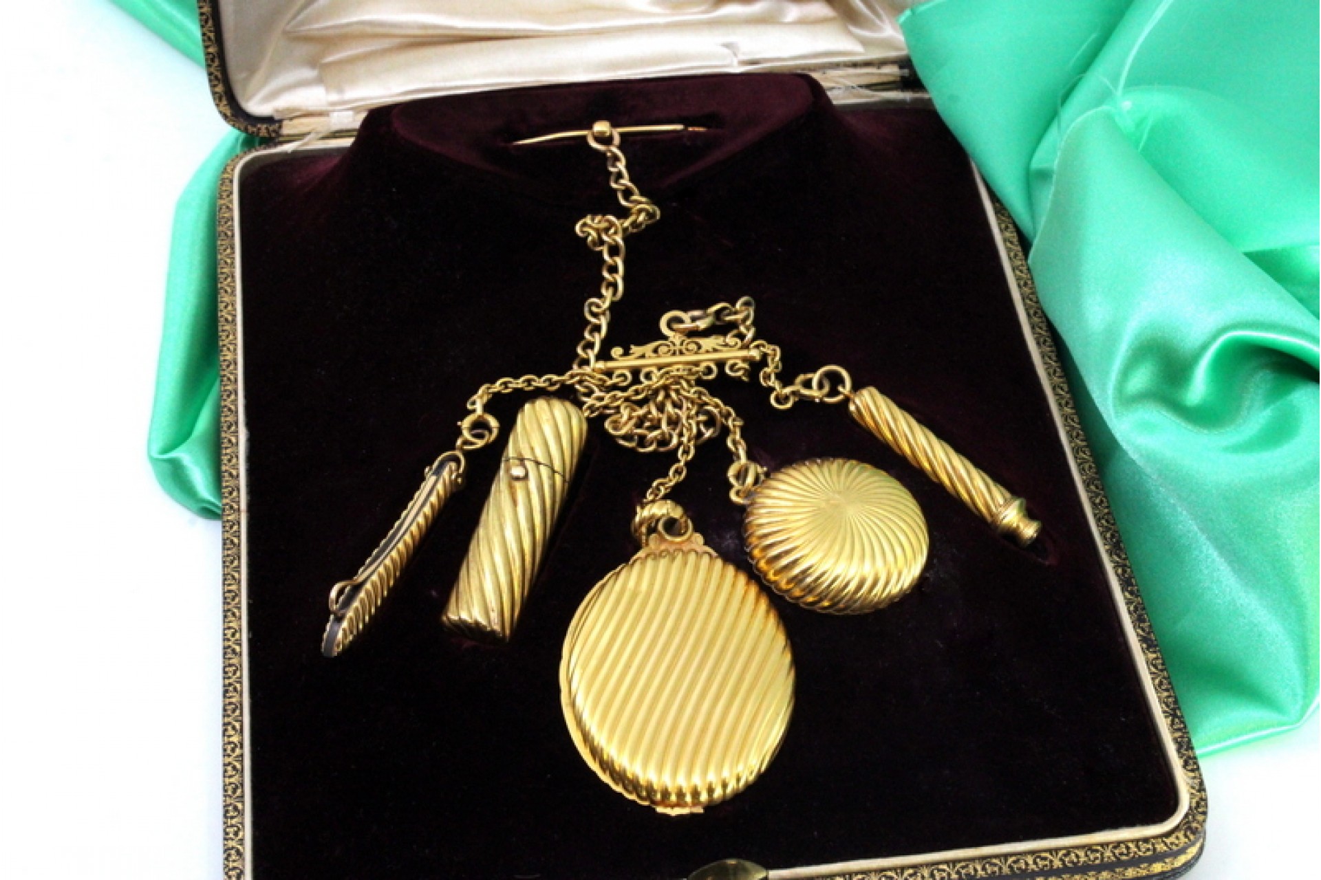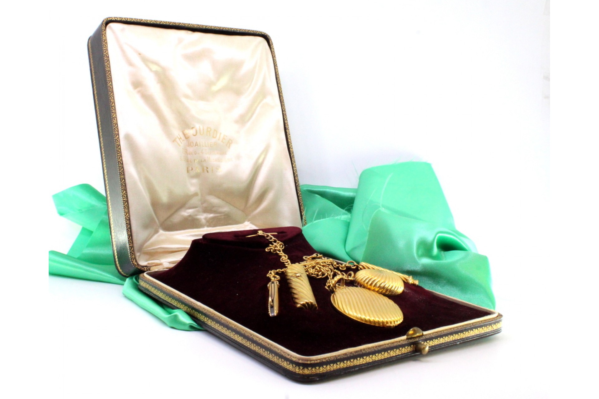 • Descrição: Utensílios  em ouro, frasco para perfume, caixa de pó de arroz, canivete, caixa de toilette com espelho no interior, lapiseira, sistema de suspenção e corrente em malha barbela com estojo original.