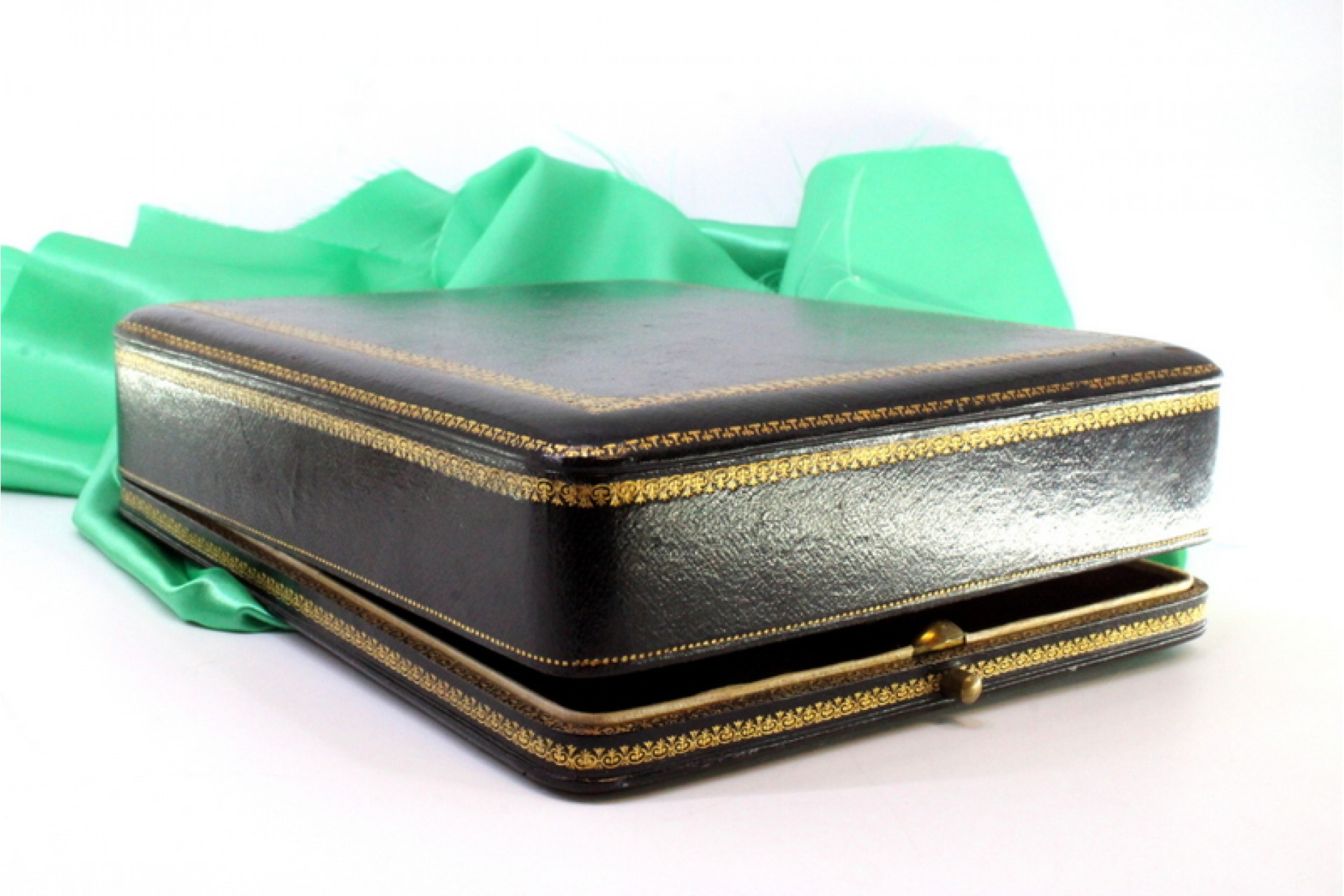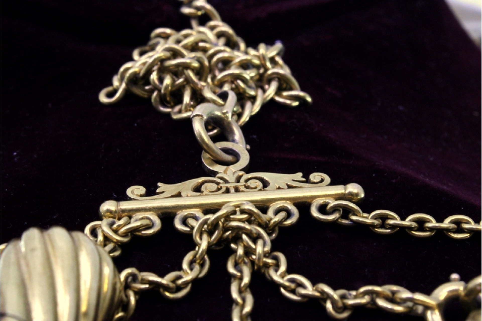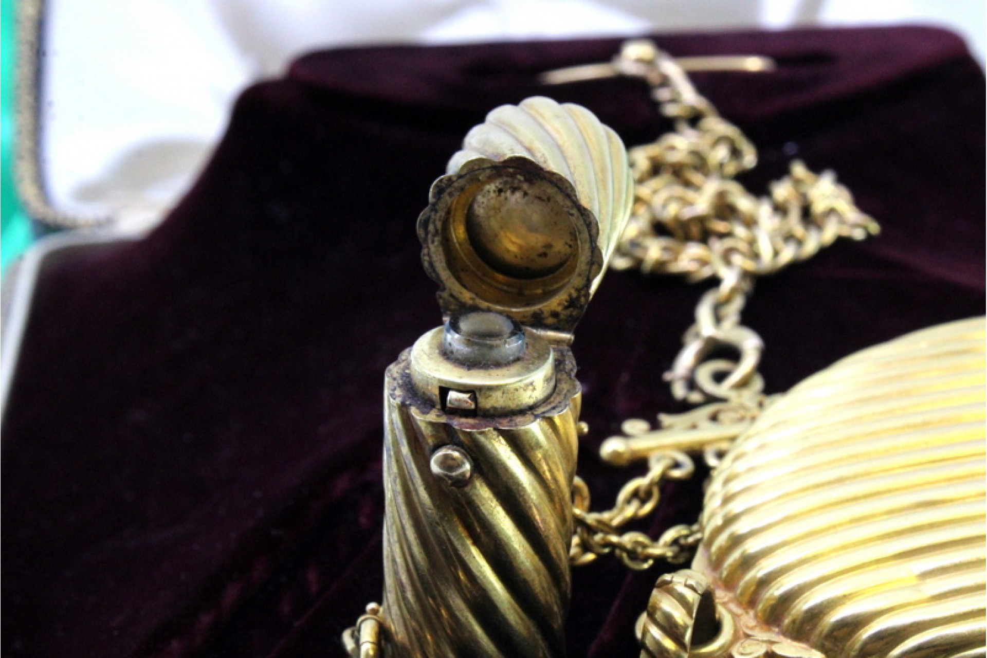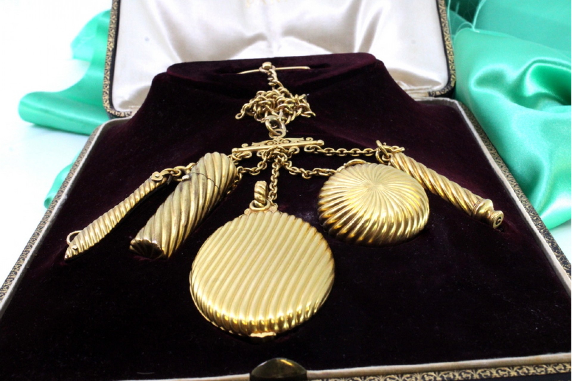 • Descrição: Utensílios  em ouro, frasco para perfume, caixa de pó de arroz, canivete, caixa de toilette com espelho no interior, lapiseira, sistema de suspenção e corrente em malha barbela com estojo original.