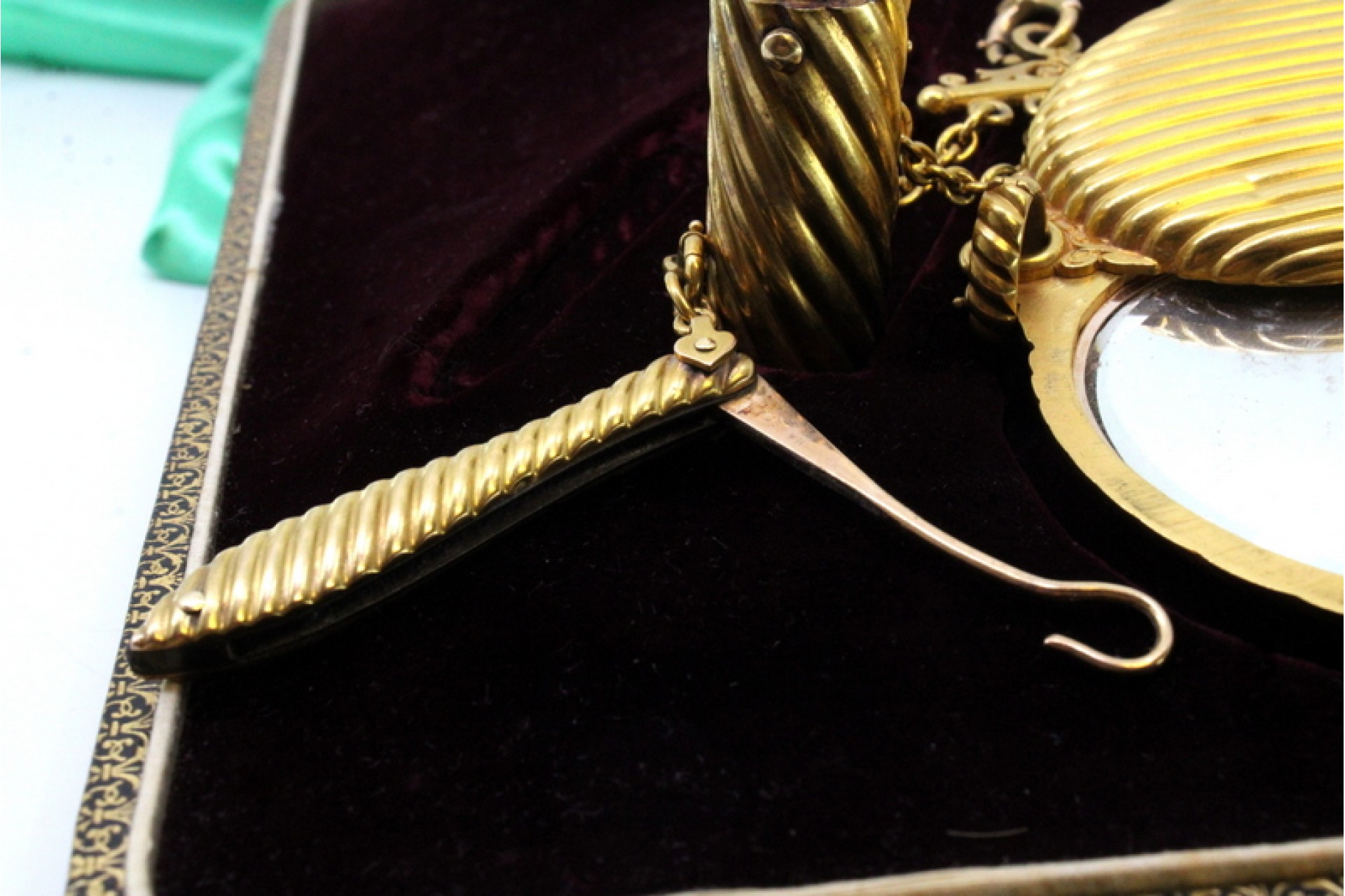 Utensílios em ouro, frasco para perfume, caixa de pó de arroz, canivete